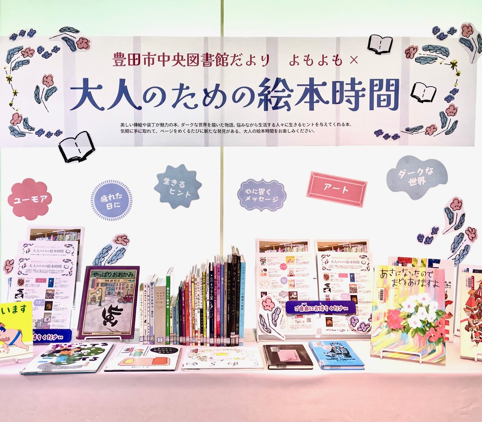 図書館だより『よもよも』1月号の特集テーマ「自分のためにページをめくろう!大人のための絵本時間」の連携展示です 大人向け絵本や大人におすすめしたい絵本を集めました |