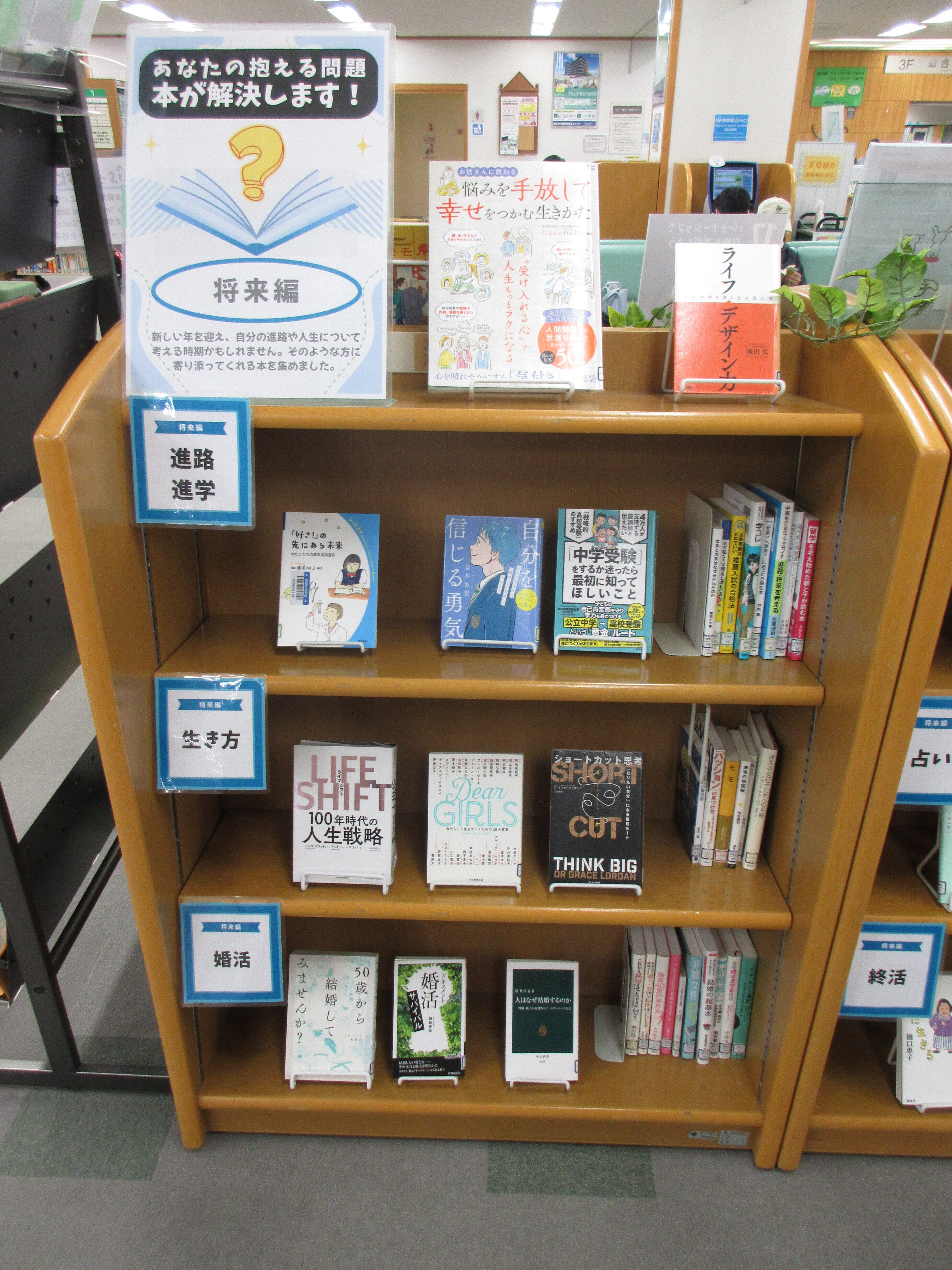 3階特集棚『あなたの抱える問題、本が解決します! ~将来編~』 |