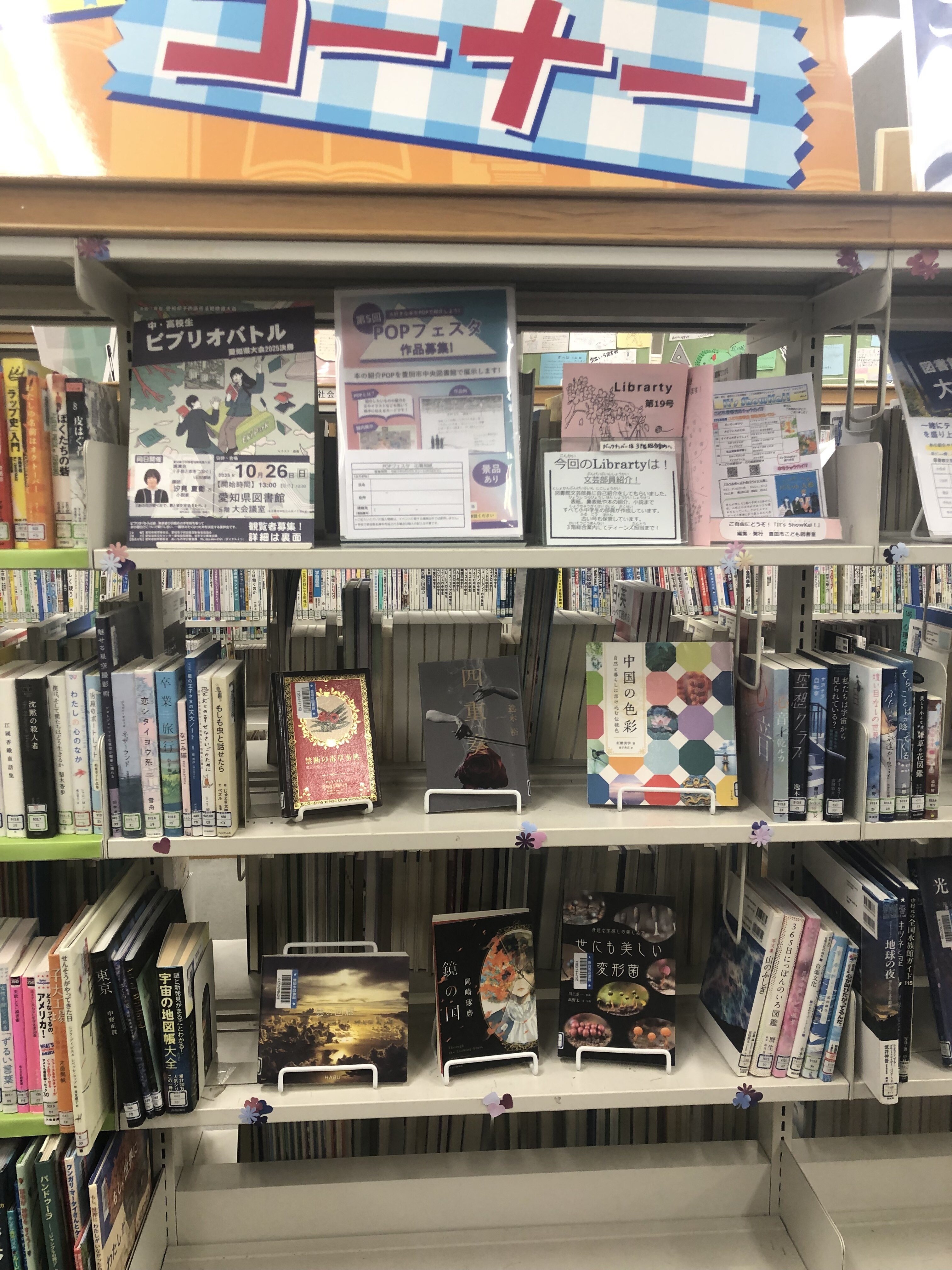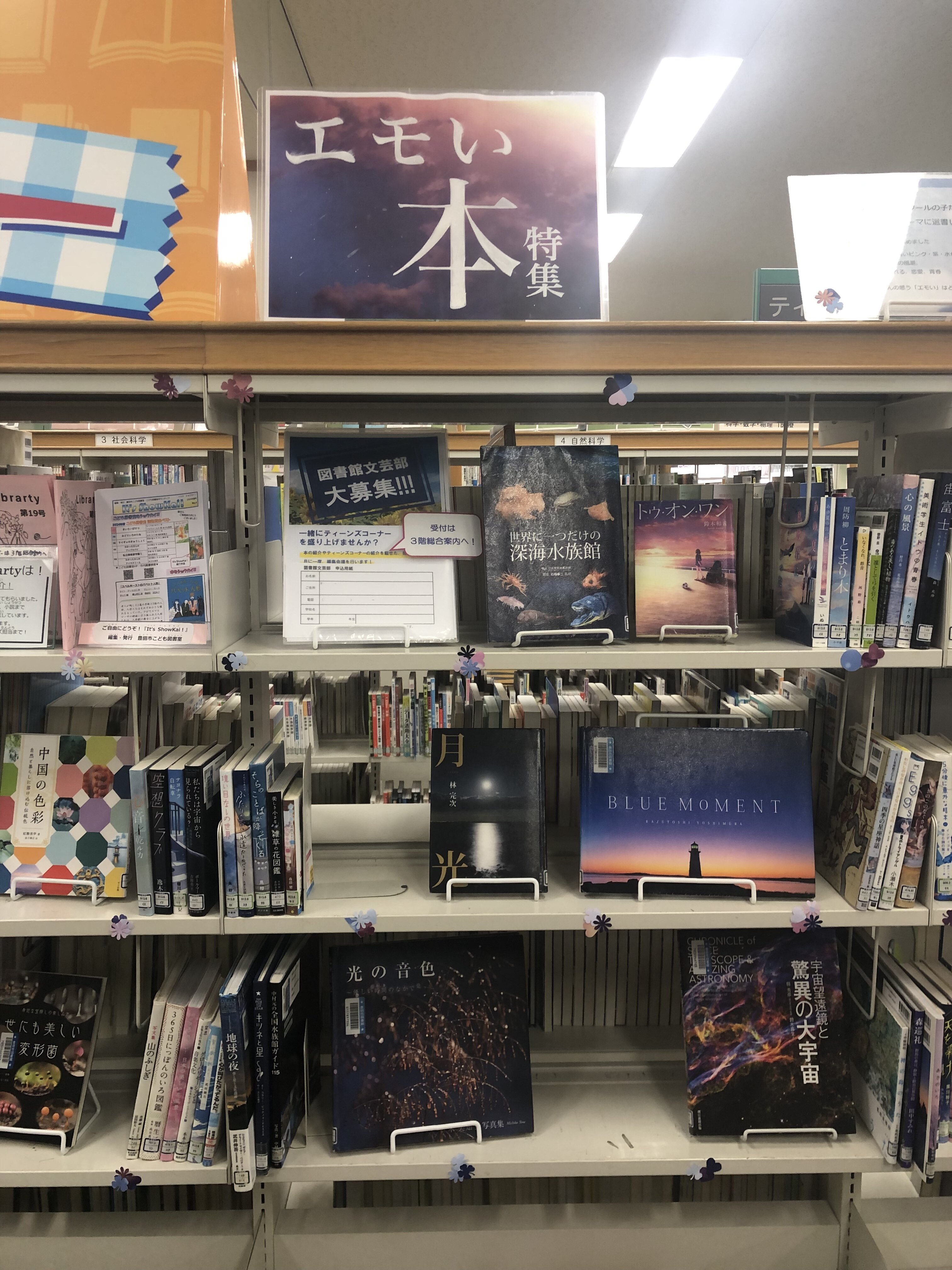 「青春」「キラキラ」「淡い印象」「きれいな風景」など高校生たちがイメージする「エモい」本を展示しています