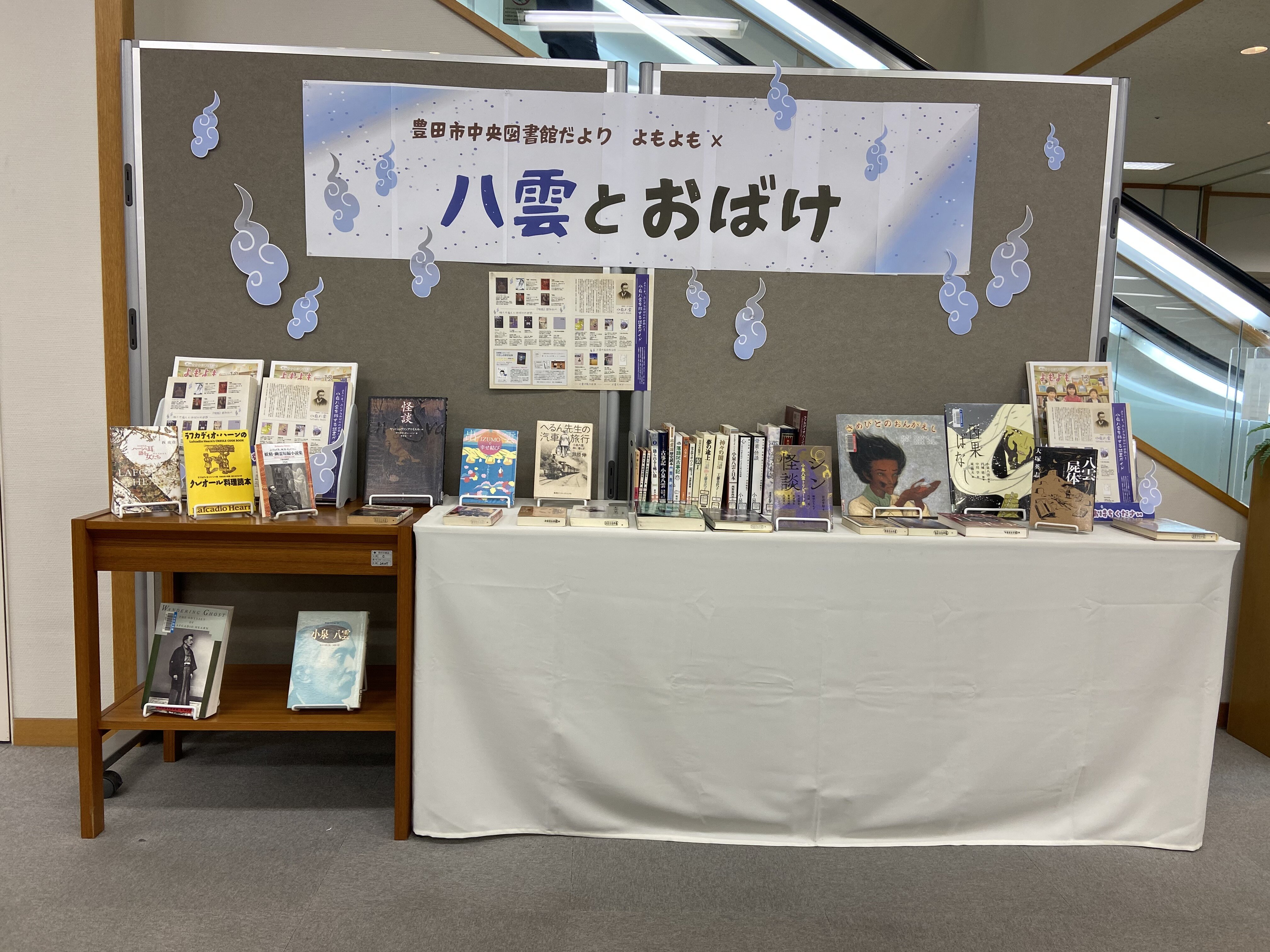 図書館だより『よもよも』12月号の特集テーマ「ようこそ、ふしぎなおばけの世界へ!小泉八雲を旅する読書ガイド」の連携展示です 小泉八雲の著書やモデルにした小説など、怪談やおばけに関する本を集めました |