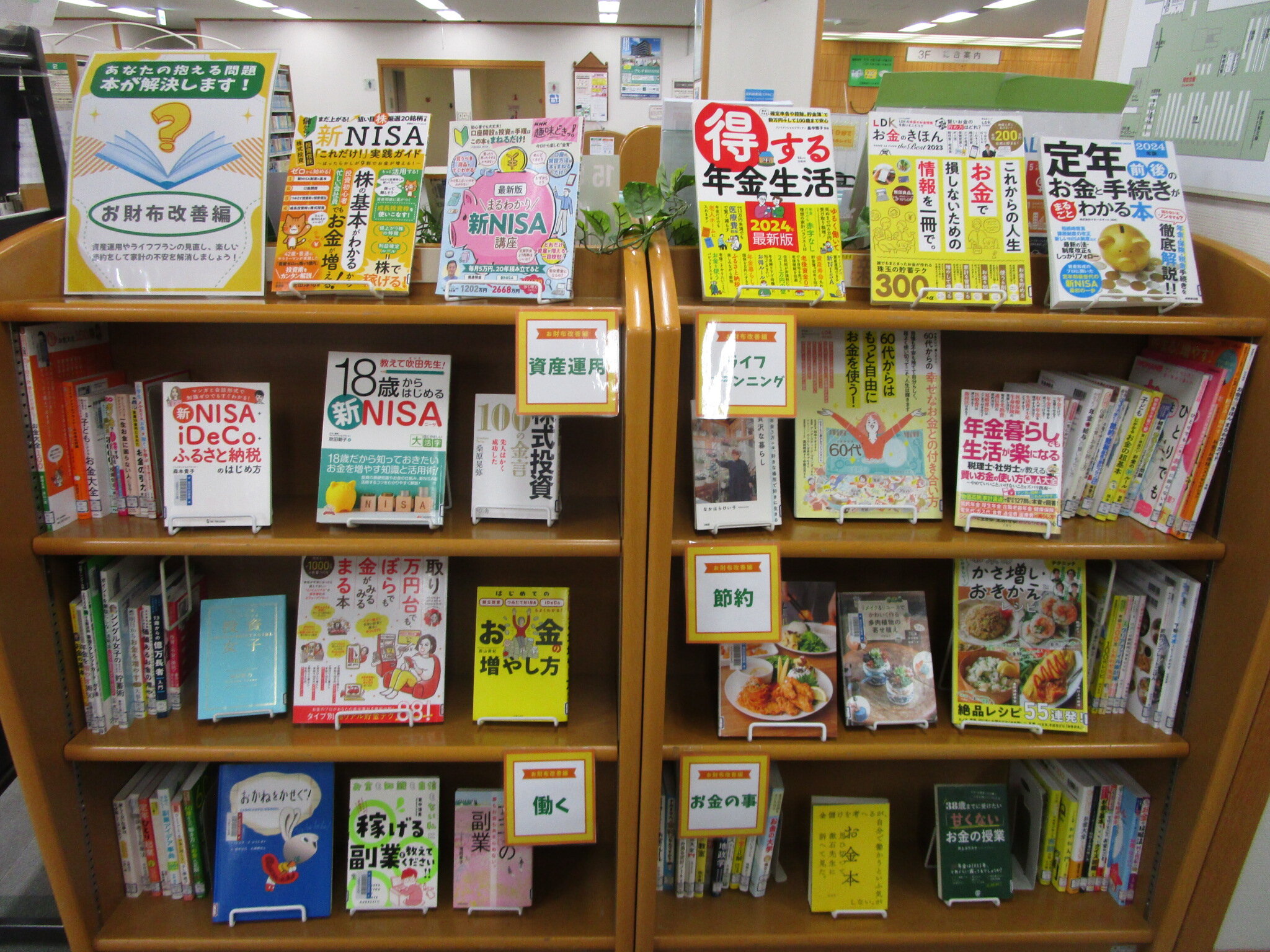3階特集棚『あなたの抱える問題、本が解決します! ~お財布改善編~』 |
