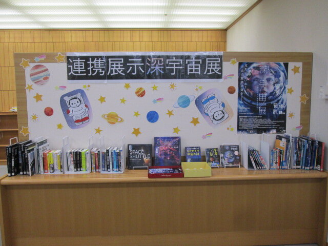 豊田市博物館で開催中の特別展「深宇宙展-人類はどこへ向かうのか-」との連携展示です 子どもから大人まで楽しめる宇宙に関する絵本や宇宙飛行士のお仕事についてなど宇宙に関する本を集めました |