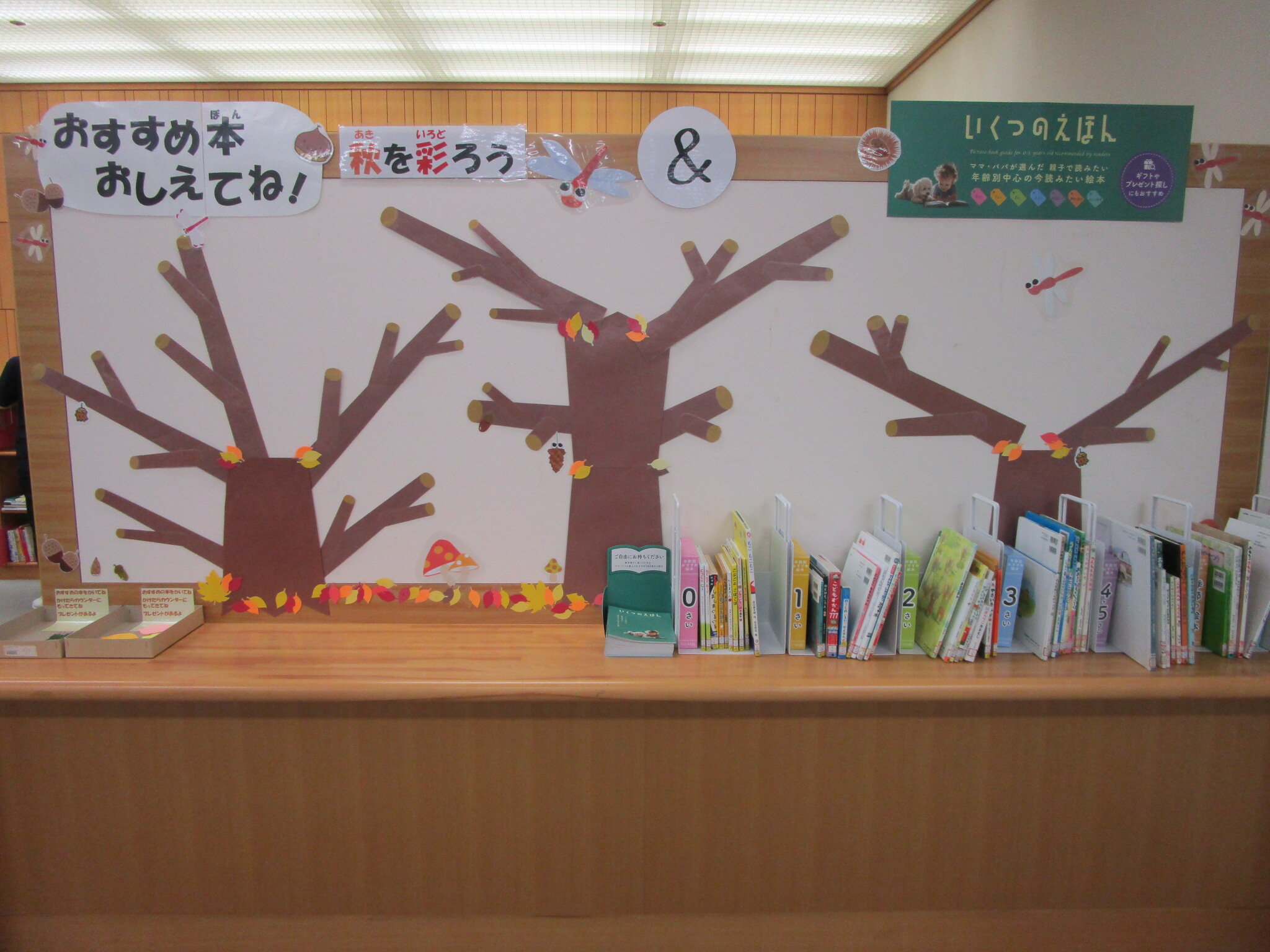 紅葉した葉っぱ型の紙におすすめ本を書き、展示コーナーに飾り付ける参加型の展示です おすすめ本を書いてくれた方にはプレゼントをお渡しします あわせて日本出版販売株式会社発行の『いくつのえほん』に掲載されている絵本を展示しています |